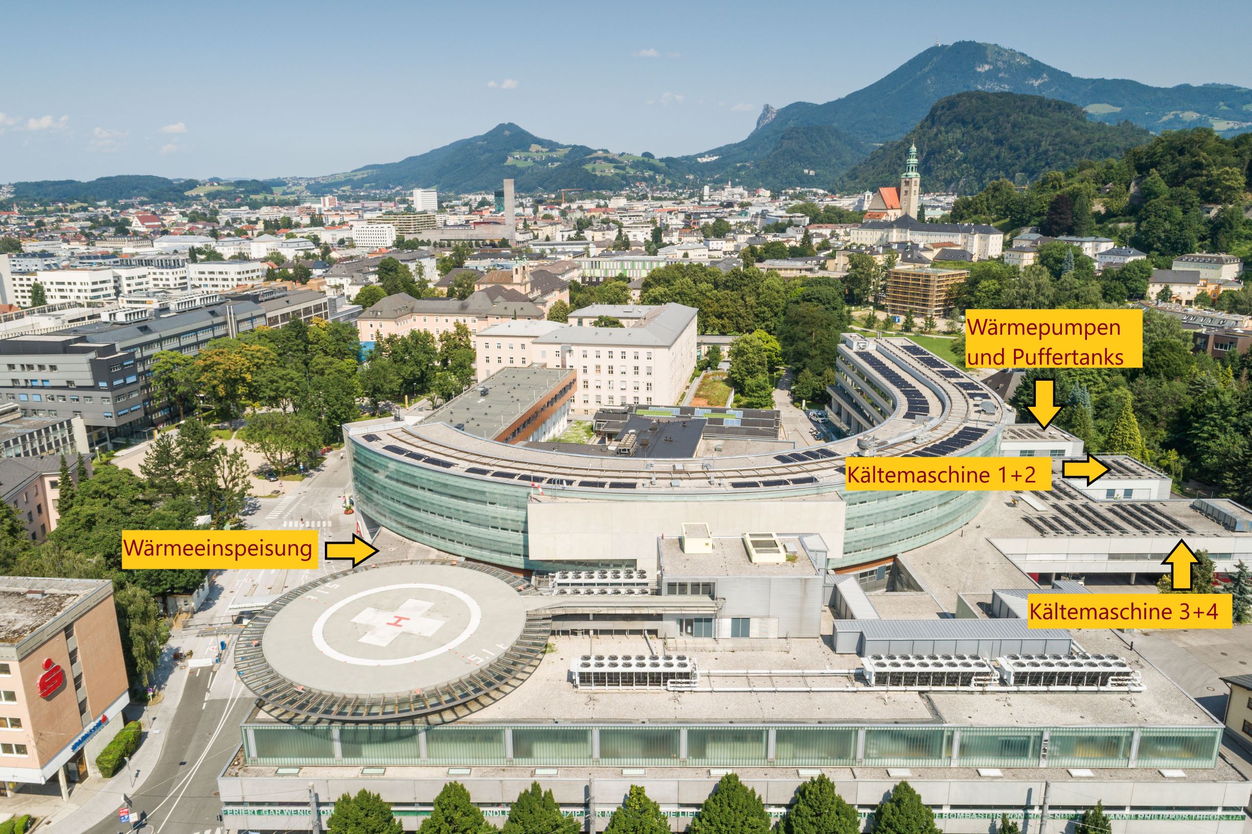 Da Nachhaltigkeit und Klimaschutz wichtige Themen für das Unternehmen sind, realisierten die Salzburger Landeskliniken im vorliegenden Projekt die Errichtung einer Wärmerückgewinnungsanlage. Als Wärmequelle dient dabei die Abwärme der Kältemaschinen, welche über Wärmetauscher den parallel geschalteten Wärmepumpen zugeführt wird. Diese erhitzen dann Warmwasser auf 69 °C, welches anschließend für die Erwärmung des Trinkwassers und für die Heizungsanlage verwendet wird.